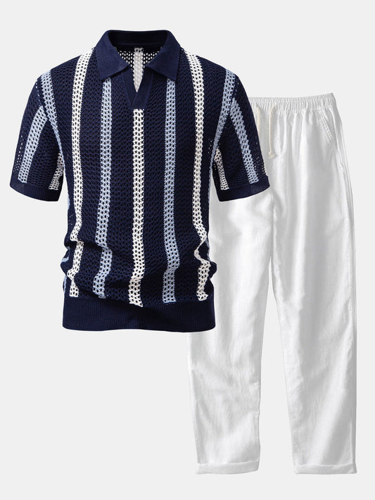 Gestreepte gehaakte V-hals Polo & linnen broek met rechte pijpen